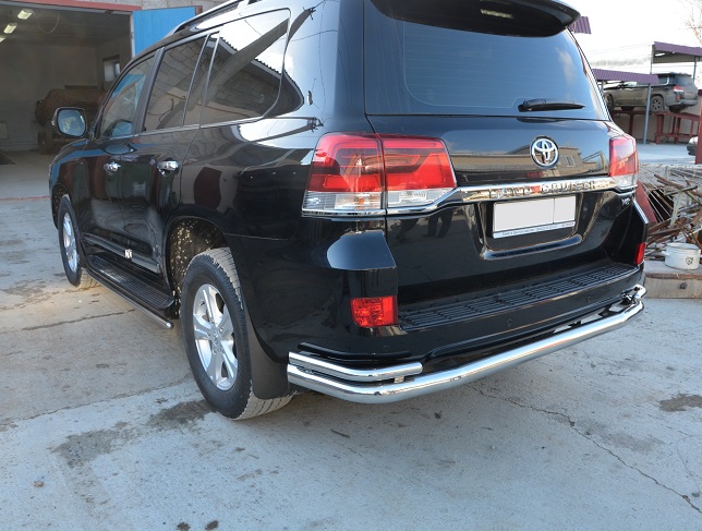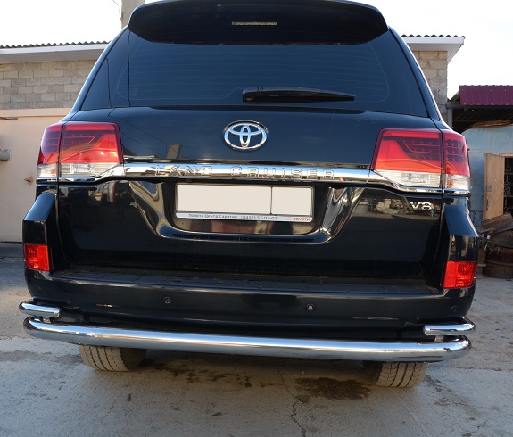 Защита заднего бампера угловая большая из нержавеющей, полировнной стали. Диаметр трубы 76-42 мм. Толщина стенки 1,5 мм. Марка стали AISI 304, Италия. Защита бампера подходит для автомобиля TOYOTA Land Cruiser 200 (Тойота Ленд Крузер 200) с 2015 года выпуска.