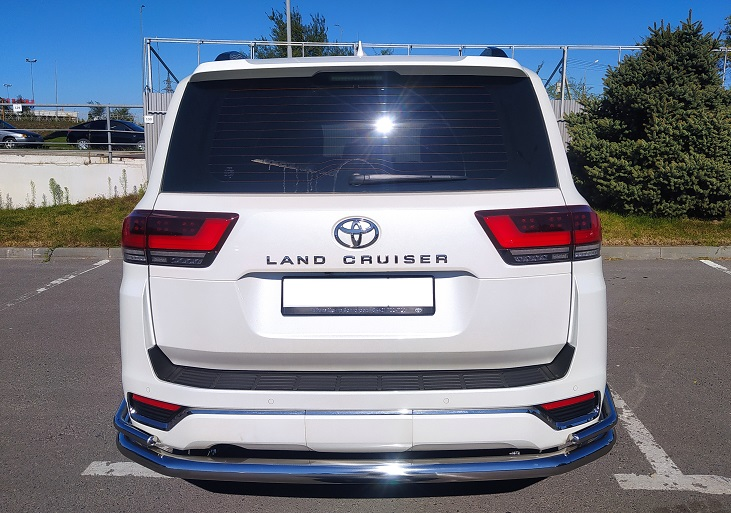 Защита заднего бампера двойная с загибами из нержавеющей, полированной стали. Диаметр трубы 76-42 мм. Толщина стенки 1,5 мм. Марка стали AISI 304, Италия. Защита бампера подходит для автомобиля TOYOTA Land Cruiser 300 70TH ANNIVERSARY (Тойота Ленд Крузер 300) с 2021 года выпуска.