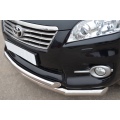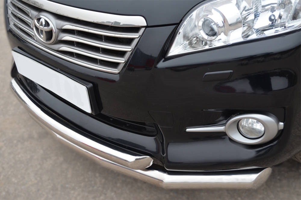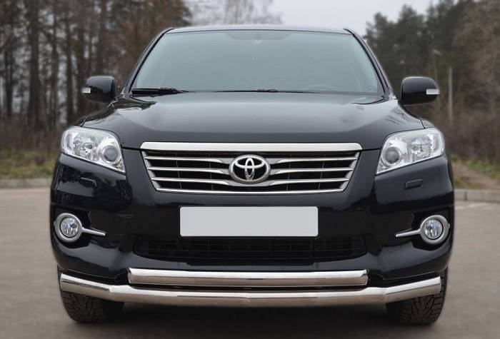 Защита переднего бампера двойная из нержавеющей, полированной стали. Диаметр трубы 60-60 мм. Толщина стенки 1,5 мм. Марка стали AISI 304, Италия. Защита бампера подходит для автомобиля TOYOTA Rav-4 (Тойота Рав 4) с 2010 по 2012 год.