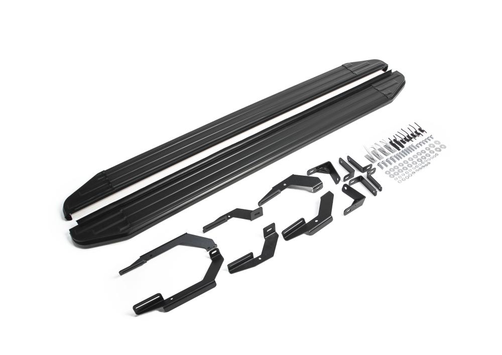 Пороги алюминиевые с черным стальным кантом. Пороги подходят для автомобиля TOYOTA Rav-4 (Тойота Рав 4) с 2013 года выпуска.