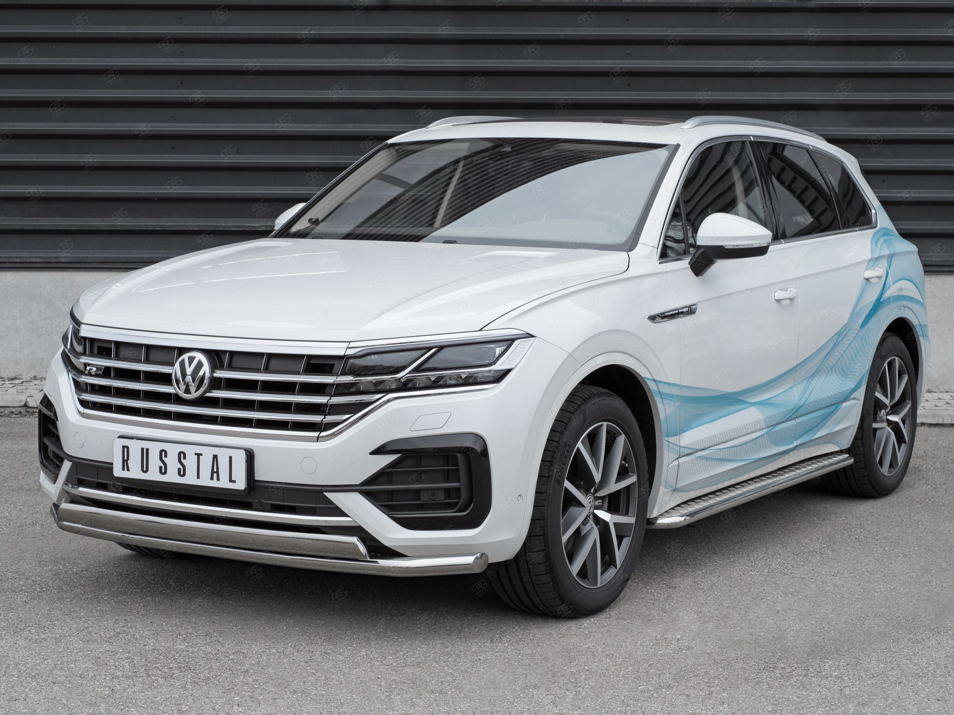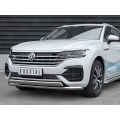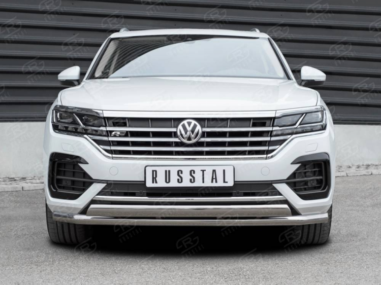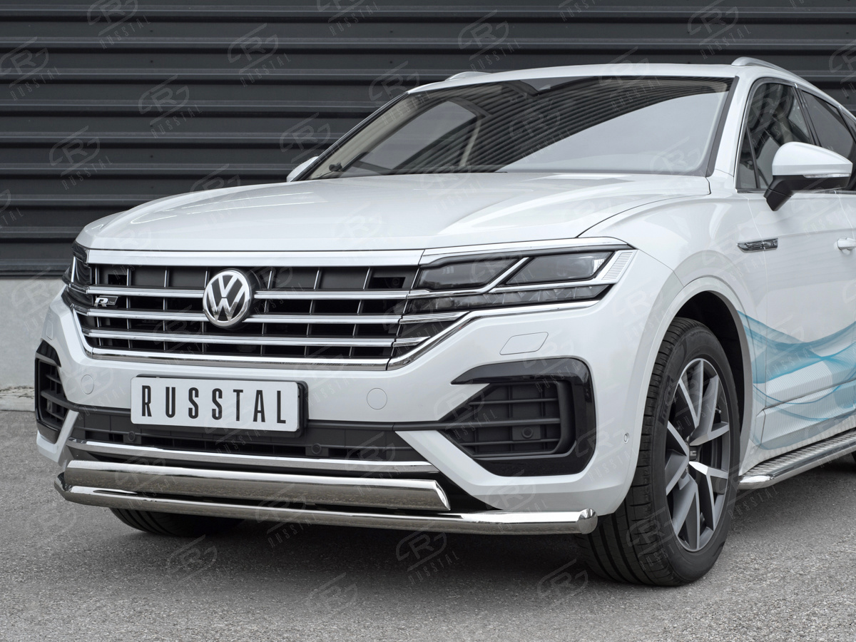 Защита переднего бампера двойная (круг+овал) из нержавеющей полированной стали. Диаметр трубы 63-75х42 мм, толщина стенки 1.5 мм. Марка стали AISI 304, Италия. Защита переднего бампера подходит для автомобиля VOLKSWAGEN Touareg (Фольксваген Туарег) с 2018 года выпуска.