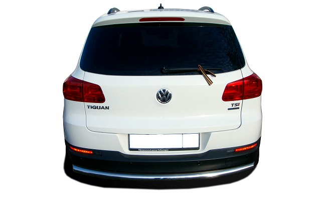 Защита заднего бампера из нержавеющей, полированной стали. Диаметр трубы 60 мм. Толщина стенки 1,5 мм. Марка стали AISI 304, Италия. Защита бампера подходит для автомобиля VOLKSWAGEN Tiguan (Фольксваген Тигуан) с 2011 по 2016 год выпуска.